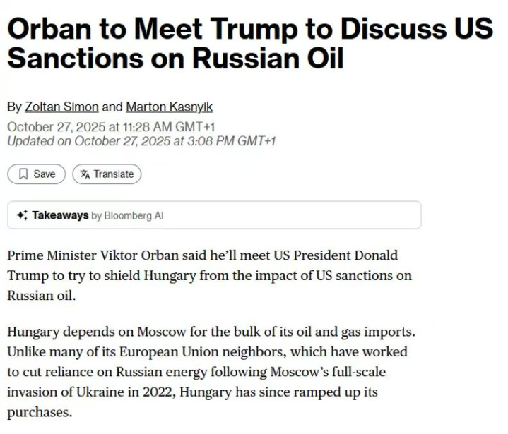 匈牙利总理欧尔班表示,他将在华盛顿与特朗普会面,寻求保护其免受美国对俄罗斯石油新制裁的影响。尽管匈牙利可以通过克罗地亚获得替代能源,但其对俄罗斯原油的依赖程度仍在增加。美国北约特使惠特克表示,布达佩斯“尚未采取任何积极措施”来减少这种依赖。