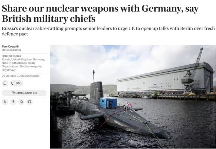 电讯报:英国国防部长敦促与德国进行谈判,分享英国的核武器。柏林已与法国就核保护问题展开谈判。